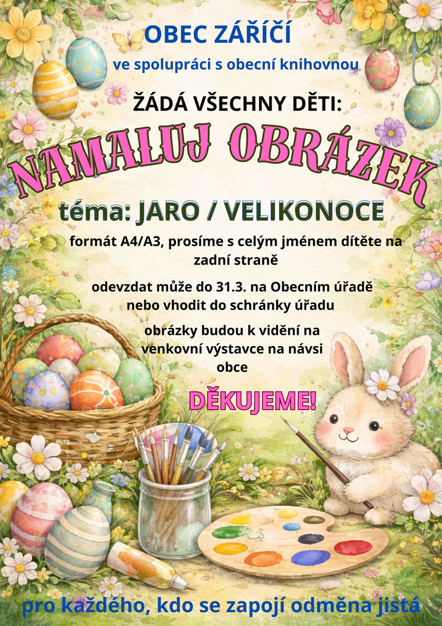 Obec Záříčí ve spolupráci s obecní knihovnou Záříčí prosí všechny rodiče, prarodiče, tetičky či strýčky o předání žádosti dětem o nový motiv obrázku na téma JARO / VELIKONOCE.